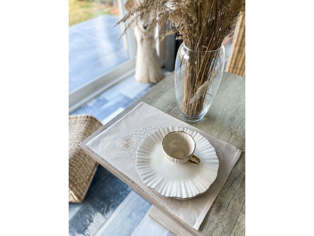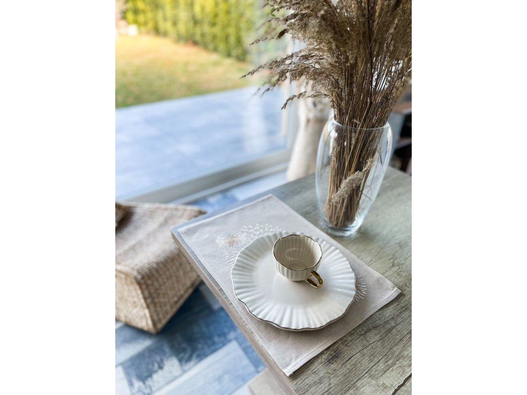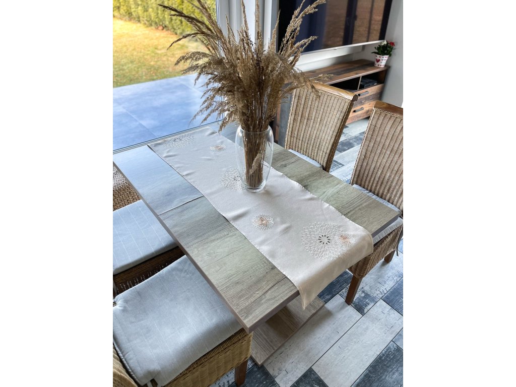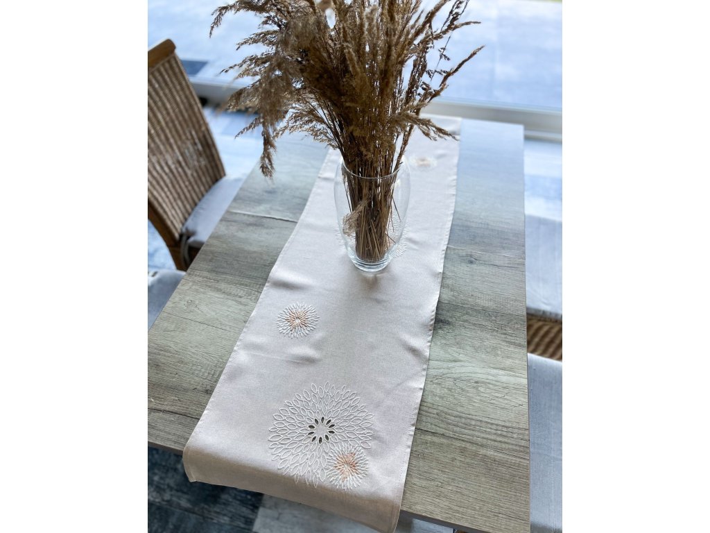 Jemný vzorovaný celoročný vzor, vo svetlo hnedej farbe oživý Váš priestor v kompletnej kolekcií rozmerov. Elegantný obrus s vyrezávaným kvetinovým vzorom je dokonalým doplnkom vášho stola po celý rok. Precízne vyrezávané detaily kvetov prinášajú jemnosť a eleganciu, vďaka čomu je vhodný na každodenné stolovanie aj slávnostné príležitosti. Vyrobený z kvalitného materiálu, ktorý je odolný a ľahko sa udržiava. Skvelá voľba pre tých, ktorí hľadajú štýl a praktickosť v jednom! Vyskladajte si set od vankúšika až po rôzne veľkosti obrusov či prestierania .