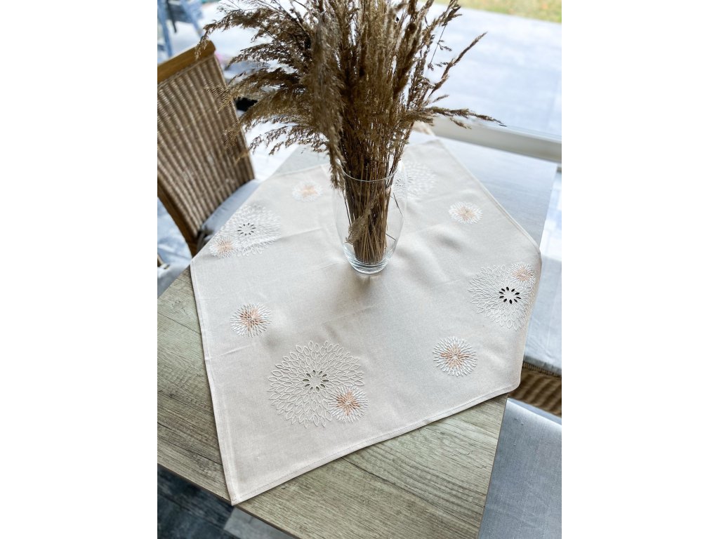 Jemný vzorovaný celoročný vzor, vo svetlo hnedej farbe oživý Váš priestor v kompletnej kolekcií rozmerov. Elegantný obrus s vyrezávaným kvetinovým vzorom je dokonalým doplnkom vášho stola po celý rok. Precízne vyrezávané detaily kvetov prinášajú jemnosť a eleganciu, vďaka čomu je vhodný na každodenné stolovanie aj slávnostné príležitosti. Vyrobený z kvalitného materiálu, ktorý je odolný a ľahko sa udržiava. Skvelá voľba pre tých, ktorí hľadajú štýl a praktickosť v jednom! Vyskladajte si set od vankúšika až po rôzne veľkosti obrusov či prestierania .