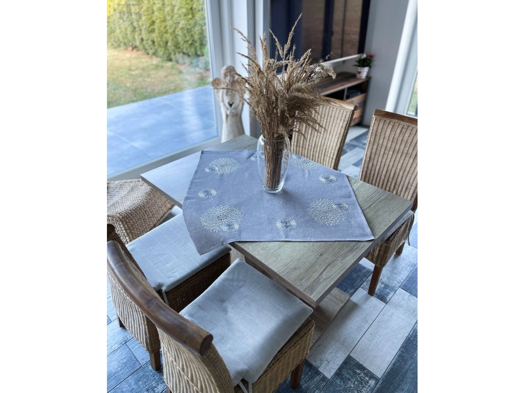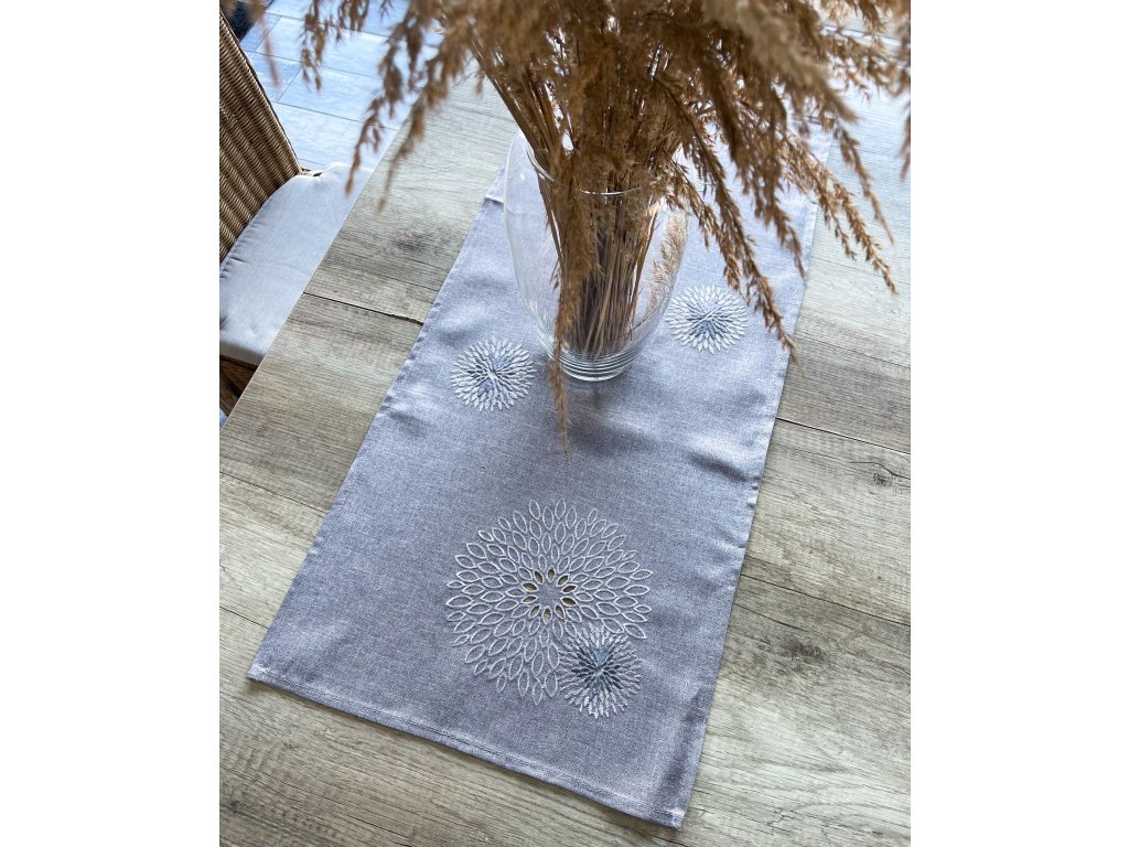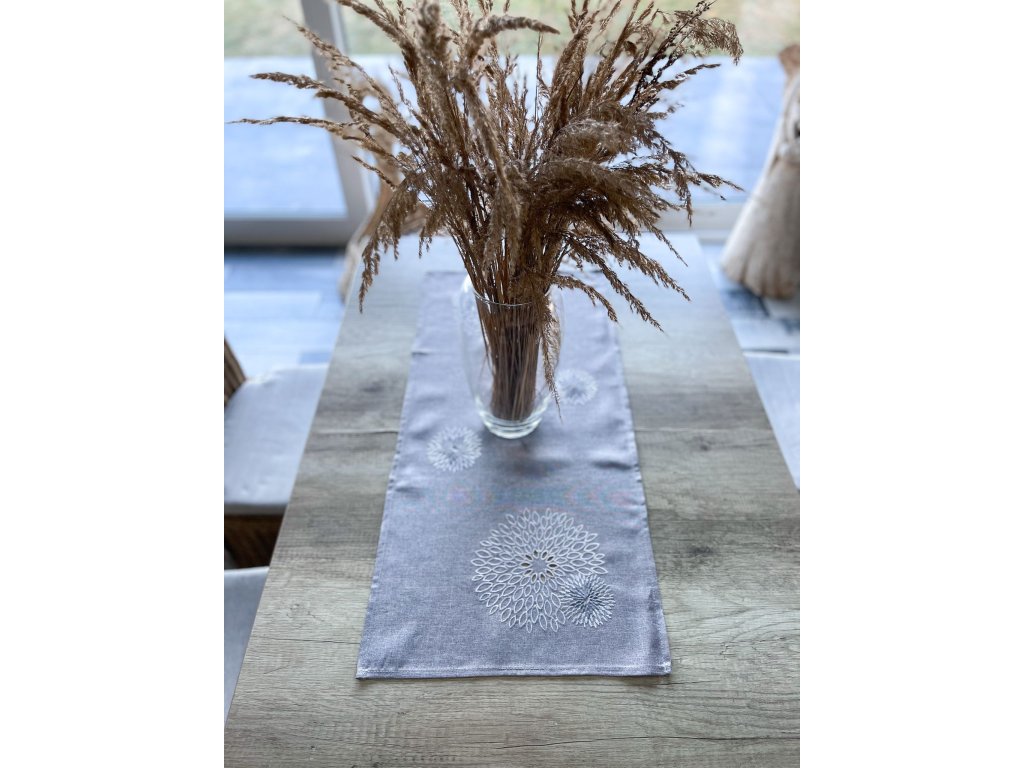 Elegantný sivý obrus s vyrezávaným kvetinovým vzorom je dokonalým doplnkom vášho stola po celý rok. Jeho neutrálny odtieň sa ľahko kombinuje s rôznymi interiérmi a dodáva priestor sofistikovaný vzhľad. Precízne vyrezávané detaily kvetov prinášajú jemnosť a eleganciu, vďaka čomu je vhodný na každodenné stolovanie aj slávnostné príležitosti. Vyrobený z kvalitného materiálu, ktorý je odolný a ľahko sa udržiava. Skvelá voľba pre tých, ktorí hľadajú štýl a praktickosť v jednom! Vyskladajte si set od vankúšika až po rôzne veľkosti obrusov či prestierania .