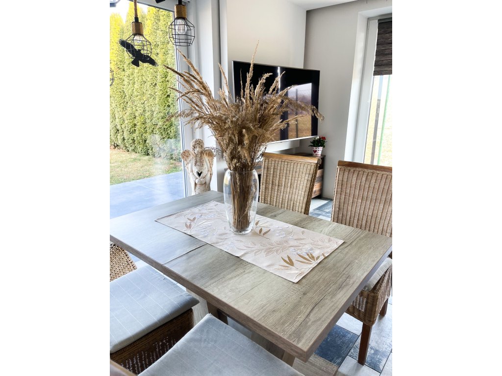 Elegantný krémový celoročný obrus s jemným kvetinovým vzorom je skvelým doplnkom každého stola.