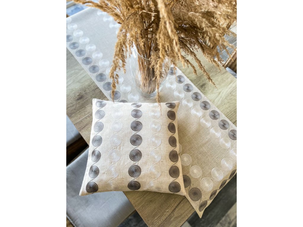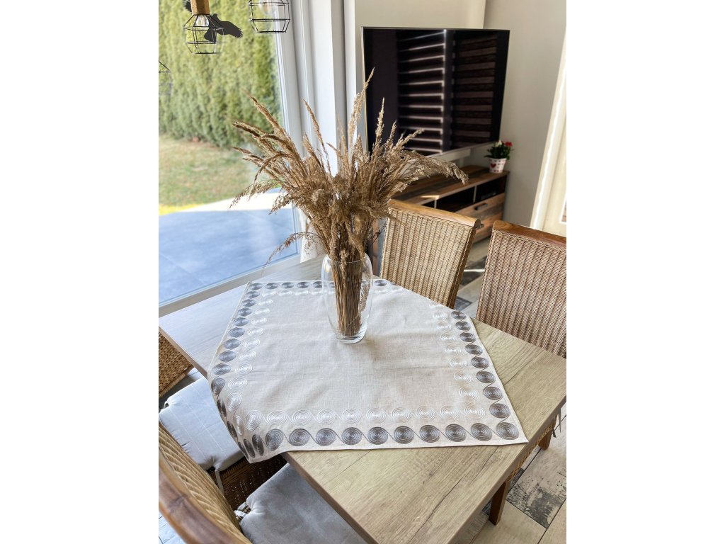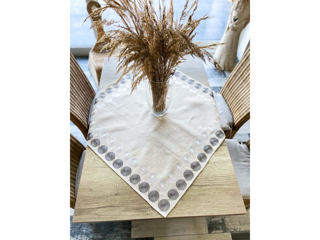 Moderný obrus v béžovej farbe so sivobielymi guľatými tvarmi je štýlovým doplnkom každého interiéru.