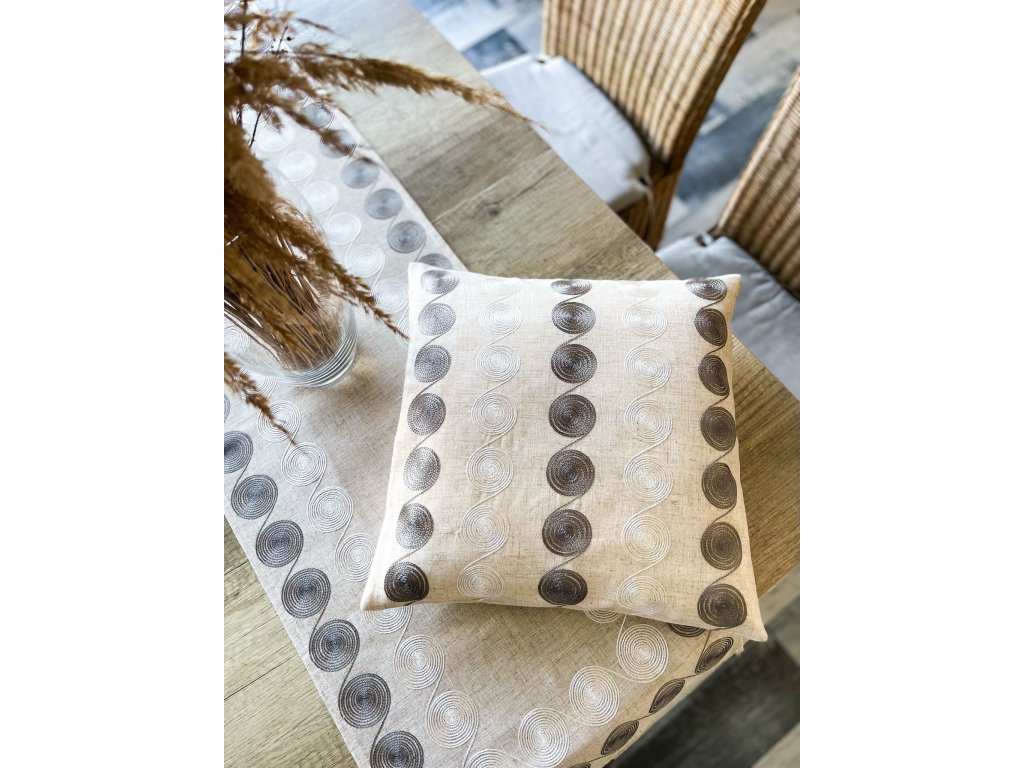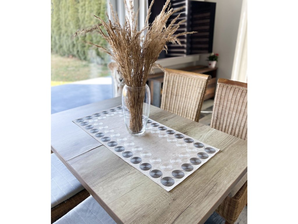 Moderný obrus v béžovej farbe so sivobielymi guľatými tvarmi je štýlovým doplnkom každého interiéru.