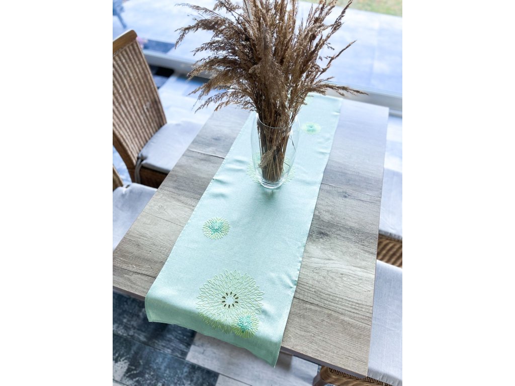 Jemný vzorovaný celoročný vzor, vo svetlo zelenej farbe oživý Váš priestor v kompletnej kolekcií rozmerov. Elegantný obrus s vyrezávaným kvetinovým vzorom je dokonalým doplnkom vášho stola po celý rok. Precízne vyrezávané detaily kvetov prinášajú jemnosť a eleganciu, vďaka čomu je vhodný na každodenné stolovanie aj slávnostné príležitosti. Vyrobený z kvalitného materiálu, ktorý je odolný a ľahko sa udržiava. Skvelá voľba pre tých, ktorí hľadajú štýl a praktickosť v jednom! Vyskladajte si set od vankúšika až po rôzne veľkosti obrusov či prestierania .
